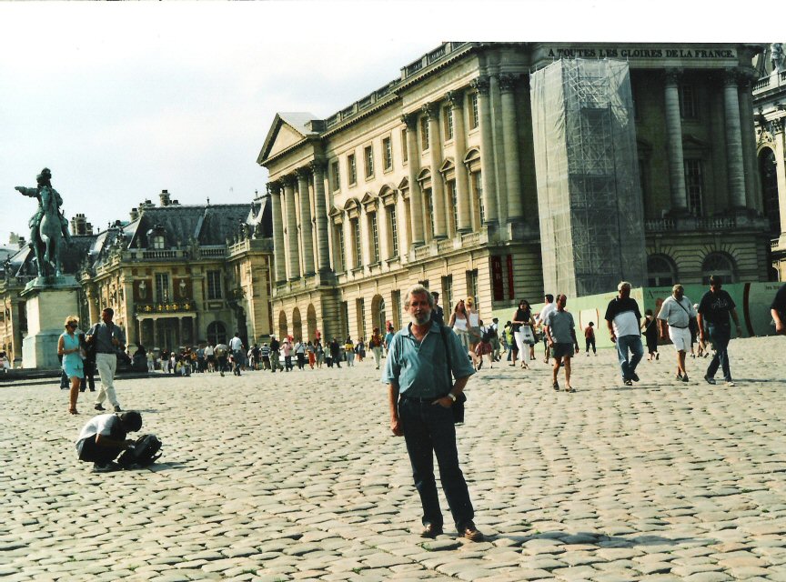 После «Фрагонара» пахнущий всей французской парфюмерией автобус отправился в Версаль, находящийся, если я правильно помню, на северо-западе от Парижа. Он строился не как загородная резиденция королей, а как полноправная столица Франции. Кроме дворцов и парка был построен город для придворных и т.п. Здесь мы разбились на две группы и по очереди провели по часовой экскурсии по части дворца. Перед дворцом опять же Людовик 14, но уже современный памятник в одеждах, стилизованных под 18 век. На хвосте у коня – бант. Многие экскурсии назначают место встречи «под бантом», мы тоже. Версаль – это уже королевский дворец, ставший музеем. Здесь спальни короля и королевы, банкетный и бильярдный зал, прочие необходимые покои. Размеры залов поскромнее, чем в Лувре. Все это великолепно расписано и драпировано. Многое погибло во время революции, но и то, что сохранилось, впечатляет. Наша Лидия рассказывала очень много интересного, но запомнить все было невозможно. Я к концу дня вообще мало, что воспринимал. Но помню, например, что из-за отсутствия туалетов во дворце сложилась негласная традиция в случае сильной нужды ходить за шторы. Так что запах стоял на приемах еще тот. Но с примесью духов, которые каждая дама сама для себя смешивала из различных компонентов, создавая свой аромат. И еще в Версале было очень плохо с отоплением, только камины, поэтому все обитатели часто болели, а иногда от простуд и умирали. Через окна дворца был виден парк с «мужским» и «дамским» партерами, фонтанами, длинным каналом. Мы в парк только заглянули, гулять уже не было ни времени, ни сил. Я сфотографировал Иру на фоне живописного негра, торгующего всякой всячиной. Их много возле всяких достопримечательностей.